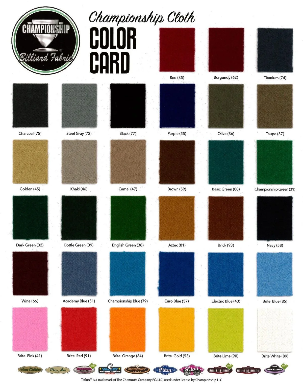 Top of the line woolen cloth, an unusual choice. This cloth does have its place though, built as arguably the highest quality, stain resistant felt. It uses a layer of DuPont™ Teflon® fabric protector for the best of the industries stain resistance. Recommended for serious players with children or commercial establishments.